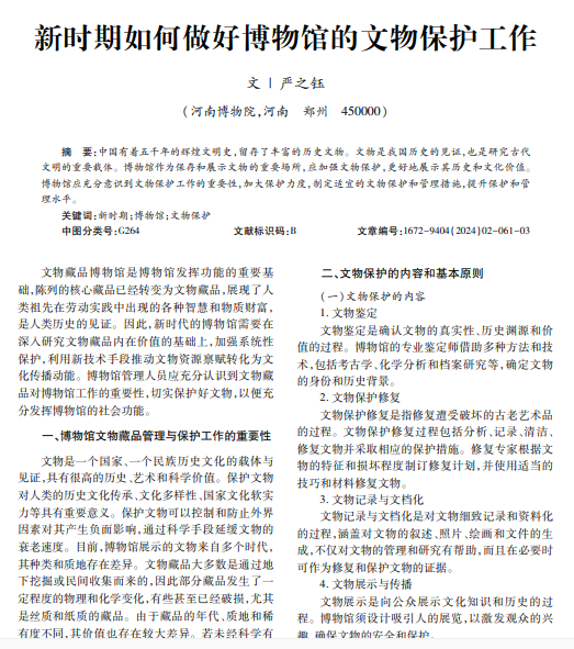 中国有着五千年的辉煌文明史,留存了丰富的历史文物。文物是我国历史的见证,也是研究古代 文明的重要载体。博物馆作为保存和展示文物的重要场所,应加强文物保护,更好地展示其历史和文化价值。 博物馆应充分意识到文物保护工作的重要性,加大保护力度,制定适宜的文物保护和管理措施,提升保护和管 理水平。