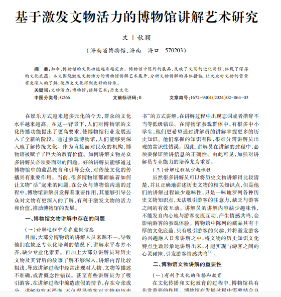 如今,博物馆的文化功能越来越突出。博物馆中陈列的展品,反映了文明的进化历程,体现了深厚 的文化底蕴。本文围绕激发文物活力的博物馆讲解艺术展开,分析文物讲解的具体措施,让大众对文物的背景 有更深入的了解,使历史文化得到更好的传承。