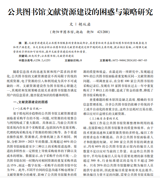 文献资源建设是公共图书馆服务的重要组成部分,其质量和效率直接影响图书馆的整体服务能力 和用户满意度。本文系统分析公共图书馆在文献资源建设过程中遇到的主要问题,提出相应策略,以增强文献 资源的多样性和可访问性,提升文献资源建设的效率和质量。