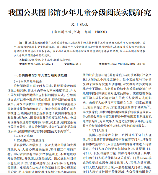随着我国阅读推广工作的逐步深入,越来越多的家长和教育工作者开始关注少年儿童的阅读。其 中,分级阅读成为备受重视的话题。为了激发少年儿童的阅读兴趣和提升阅读能力,我国公共图书馆开始探索 并实践分级阅读的方法和策略。本文指出我国公共图书馆分级阅读实践中存在的问题,给出公共图书馆开展 少儿分级阅读服务的优化建议。