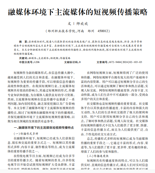 在新媒体时代,随着人们获取资讯的途径越来越广泛、获取信息的速度越来越快,抖音、快手等新 媒体平台短视频内容也日益丰富。在融媒体环境下,主流媒体短视频的传播策略对自媒体人的发展具有重要 意义。本文分析融媒体环境下主流媒体短视频的传播特点、面临的问题和挑战,探讨融媒体环境下主流媒体的 短视频传播策略。