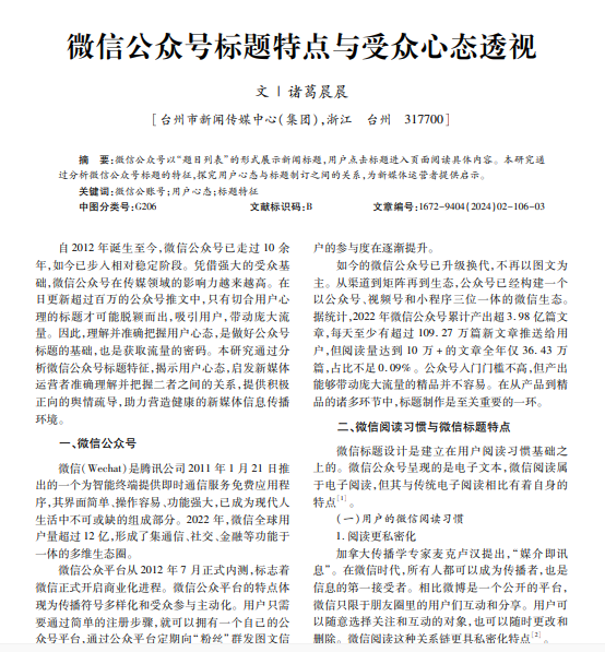 微信公众号以“题目列表”的形式展示新闻标题,用户点击标题进入页面阅读具体内容。本研究通 过分析微信公众号标题的特征,探究用户心态与标题制订之间的关系,为新媒体运营者提供启示。