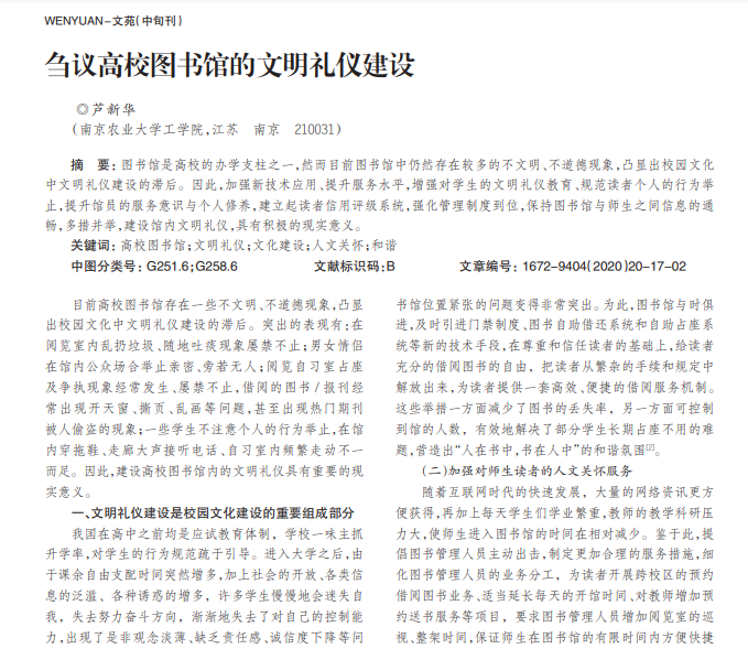 图书馆是高校的办学支柱之一,然而目前图书馆中仍然存在较多的不文明、不道德现象,凸显出校园文化 中文明礼仪建设的滞后。因此,加强新技术应用、提升服务水平,增强对学生的文明礼仪教育、规范读者个人的行为举 止,提升馆员的服务意识与个人修养,建立起读者信用评级系统,强化管理制度到位,保持图书馆与师生之间信息的通 畅,多措并举,建设馆内文明礼仪,具有积极的现实意义。