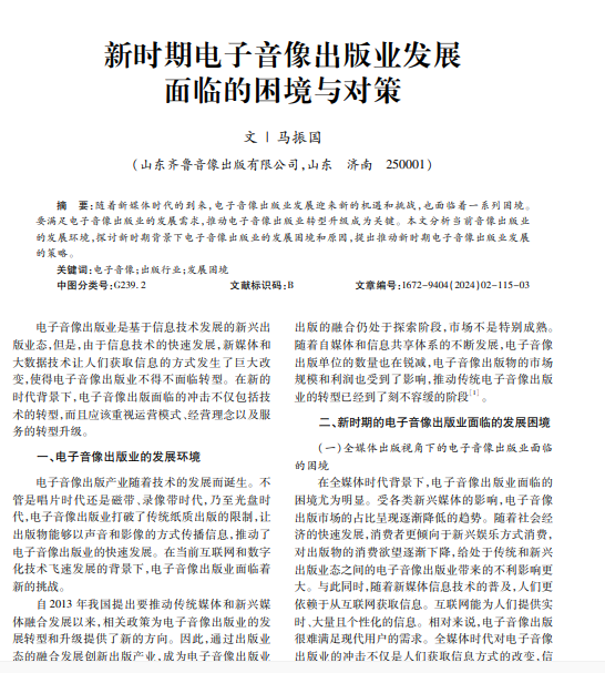 随着新媒体时代的到来,电子音像出版业发展迎来新的机遇和挑战,也面临着一系列困境。 要满足电子音像出版业的发展需求,推动电子音像出版业转型升级成为关键。本文分析当前音像出版业 的发展环境,探讨新时期背景下电子音像出版业的发展困境和原因,提出推动新时期电子音像出版业发展 的策略。