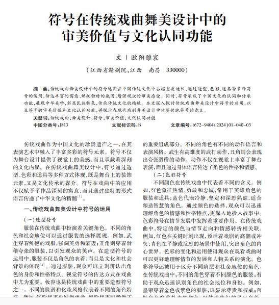 传统戏曲舞美设计中的符号运用在中国传统文化中占据重要地位,通过造型、色彩、道具等多种符 号的运用,传达丰富的寓意、烘托独特的氛围、增强观众的审美感受。同时,符号承载了中国文化的认同和传承 功能,展现中华美学,彰显民族特色,传承传统文化的精髓。本文深入探讨传统戏曲舞美设计中符号的应用,以 及符号的审美价值和文化认同功能,并探讨在现代戏剧舞美设计中借鉴传统符号的意义。