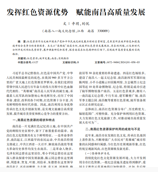 红色资源作为反映中国共产党和中华民族光辉发展历程的宝贵财富,是彰显所在城市特色和提高 城市综合竞争力的重要因素。本文以“英雄城”南昌为例,就城市红色资源发展现状、存在的问题,以及新时代 如何开发利用红色资源等,展开调查研究和思考,探索南昌在红色精神的引领下,实现城市高质量发展的实践 路径。