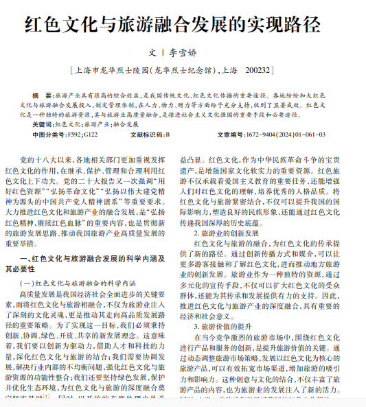 旅游产业具有很高的综合效益,是我国传统文化、红色文化传播的重要途径。各地纷纷加大红色 文化与旅游融合发展投入,制定管理体制,在人力、物力、财力等方面给予充分支持,收到了显著成效。红色文 化是一种独特的旅游资源,其与旅游业高质量融合,是推进社会主义文化强国的重要手段和必要途径。