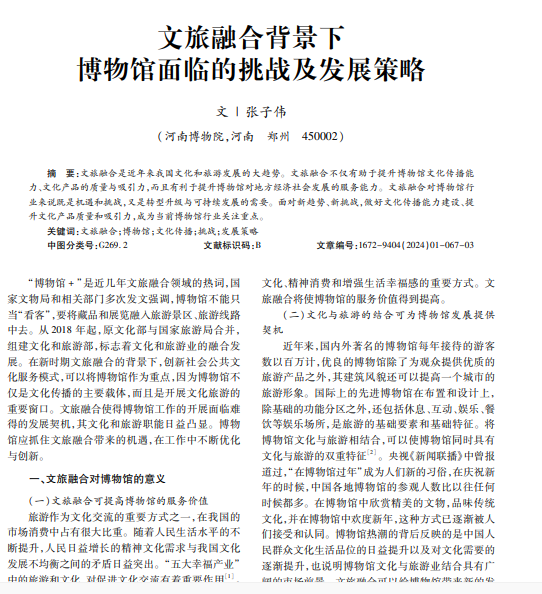 文旅融合是近年来我国文化和旅游发展的大趋势。文旅融合不仅有助于提升博物馆文化传播能 力、文化产品的质量与吸引力,而且有利于提升博物馆对地方经济社会发展的服务能力。文旅融合对博物馆行 业来说既是机遇和挑战,又是转型升级与可持续发展的需要。面对新趋势、新挑战,做好文化传播能力建设、提 升文化产品质量和吸引力,成为当前博物馆行业关注重点。