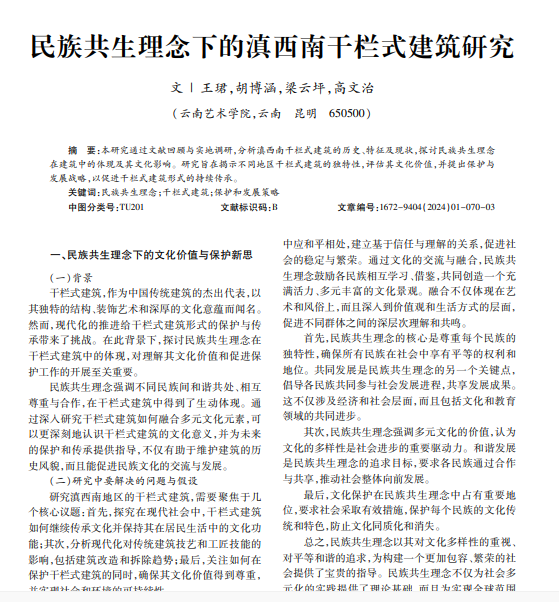 本研究通过文献回顾与实地调研,分析滇西南干栏式建筑的历史、特征及现状,探讨民族共生理念 在建筑中的体现及其文化影响。研究旨在揭示不同地区干栏式建筑的独特性,评估其文化价值,并提出保护与 发展战略,以促进干栏式建筑形式的持续传承。
