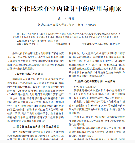 本文探讨数字化技术在室内设计中的应用现状、优势以及未来发展趋势,通过研究数字化技术在 室内设计中的应用案例,分析其对设计效率、创新性及可持续性的影响,展望数字化技术在室内设计中的前景。