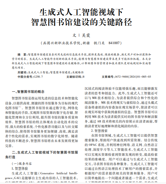 智慧图书馆建设旨在利用先进的信息技术手段,提供更高效、便捷的服务,满足用户对知识获取和 学习的需求。生成式人工智能作为创新的技术手段,能够为智慧图书馆建设带来更多可能性和机遇。本文分 析生成式人工智能视域下智慧图书馆建设的关键路径,以帮助图书馆管理者和技术团队更好地规划和实施智 慧化项目。
