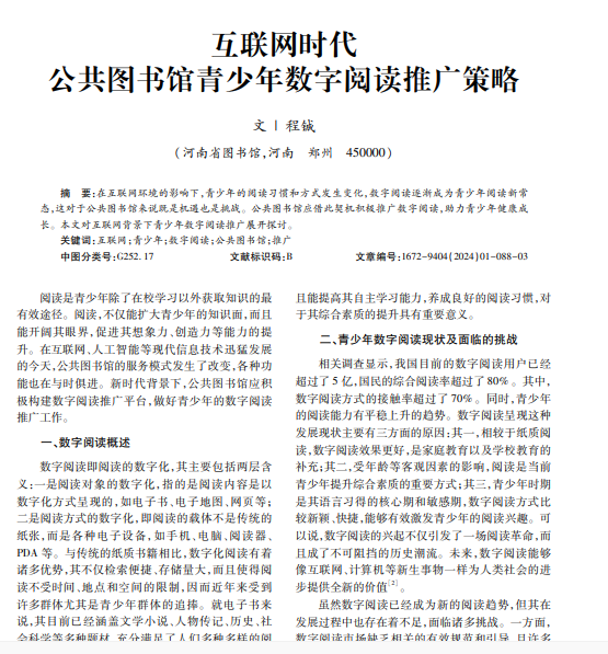 在互联网环境的影响下,青少年的阅读习惯和方式发生变化,数字阅读逐渐成为青少年阅读新常 态,这对于公共图书馆来说既是机遇也是挑战。公共图书馆应借此契机积极推广数字阅读,助力青少年健康成 长。本文对互联网背景下青少年数字阅读推广展开探讨。