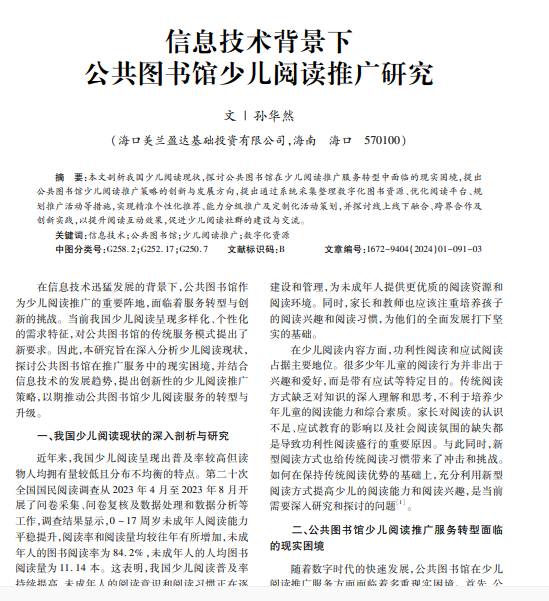 本文剖析我国少儿阅读现状,探讨公共图书馆在少儿阅读推广服务转型中面临的现实困境,提出 公共图书馆少儿阅读推广策略的创新与发展方向,提出通过系统采集整理数字化图书资源、优化阅读平台、规 划推广活动等措施,实现精准个性化推荐、能力分级推广及定制化活动策划,并探讨线上线下融合、跨界合作及 创新实践,以提升阅读互动效果,促进少儿阅读社群的建设与交流。