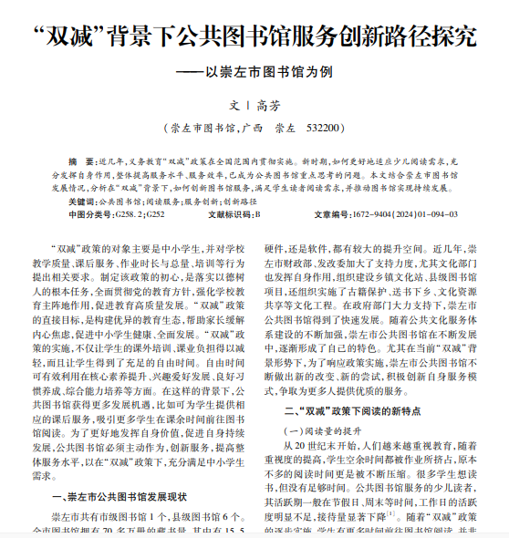 近几年,义务教育“双减”政策在全国范围内贯彻实施。新时期,如何更好地适应少儿阅读需求,充 分发挥自身作用,整体提高服务水平、服务效率,已成为公共图书馆重点思考的问题。本文结合崇左市图书馆 发展情况,分析在“双减”背景下,如何创新图书馆服务,满足学生读者阅读需求,并推动图书馆实现持续发展。