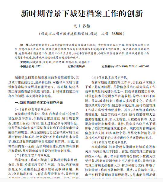 在新时期背景下,城市建设档案工作面临着诸多挑战。资料档案内容不全面、档案管理工作不规 范、信息技术应用水平低、档案管理重视程度不高等问题制约着城建档案工作的发展。本文对此提出创新思 路,包括做好长期宣传工作、提升工作人员素质、持续丰富档案资料、合理利用信息技术等,推动城建档案工作 向高水平迈进,提升城市建设档案管理的质量和效率。
