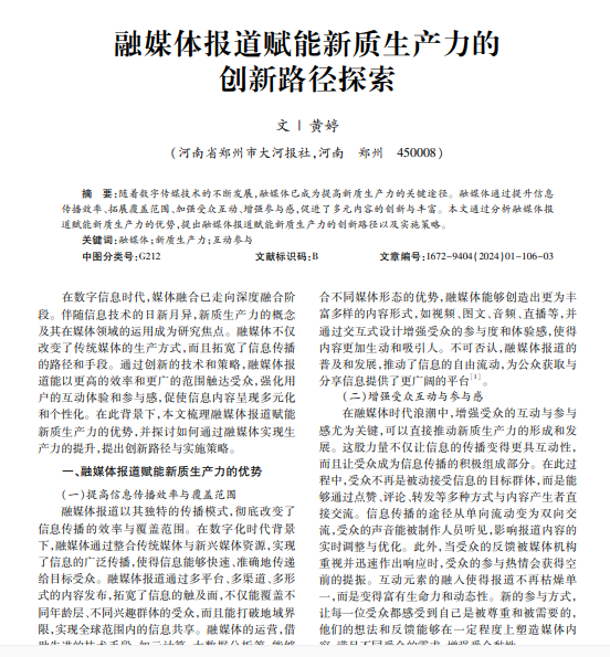 随着数字传媒技术的不断发展,融媒体已成为提高新质生产力的关键途径。融媒体通过提升信息 传播效率、拓展覆盖范围、加强受众互动、增强参与感,促进了多元内容的创新与丰富。本文通过分析融媒体报 道赋能新质生产力的优势,提出融媒体报道赋能新质生产力的创新路径以及实施策略。