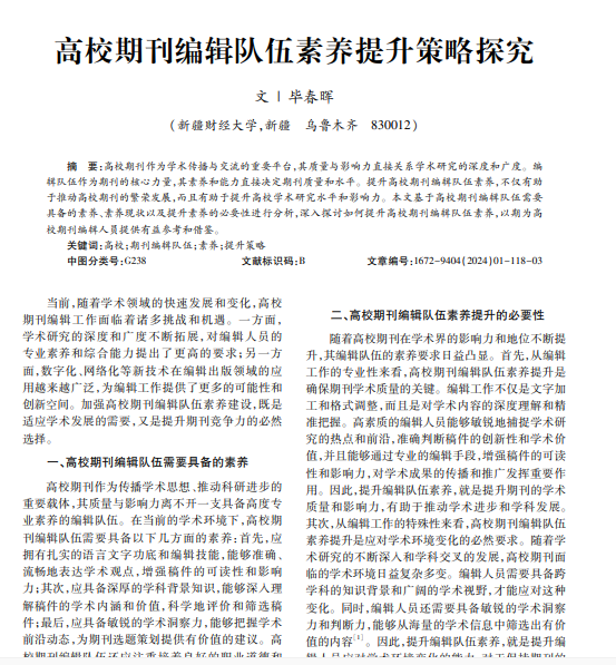 高校期刊作为学术传播与交流的重要平台,其质量与影响力直接关系学术研究的深度和广度。编 辑队伍作为期刊的核心力量,其素养和能力直接决定期刊质量和水平。提升高校期刊编辑队伍素养,不仅有助 于推动高校期刊的繁荣发展,而且有助于提升高校学术研究水平和影响力。本文基于高校期刊编辑队伍需要 具备的素养、素养现状以及提升素养的必要性进行分析,深入探讨如何提升高校期刊编辑队伍素养,以期为高 校期刊编辑人员提供有益参考和借鉴。