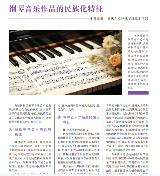 为推动我国 钢琴音乐艺术的 高质量发展,应明 确钢琴音乐作品 的民族化特征,如 作品节奏的民族 化、作品旋律的民 族化、作品和声的 民族化、曲式结构 的民族化、调式调 性的民族化、作品 复 调 的 民 族 化 、 作品赋意的民族 化等。