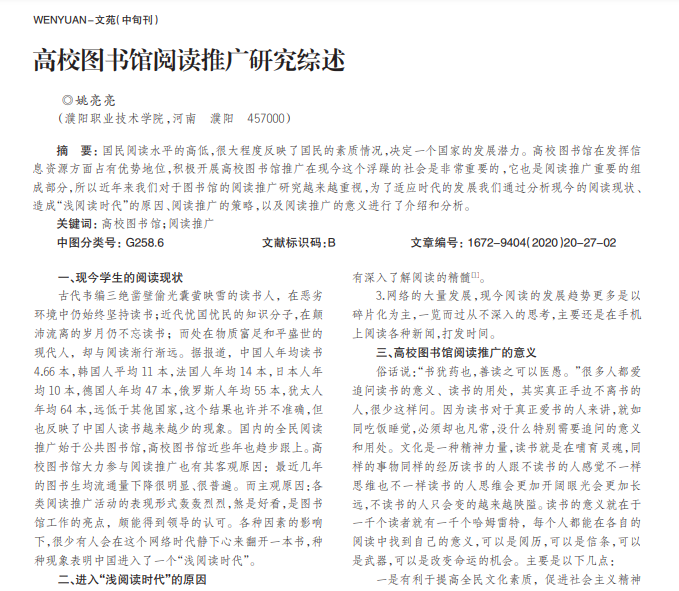 国民阅读水平的高低,很大程度反映了国民的素质情况,决定一个国家的发展潜力。高校图书馆在发挥信 息资源方面占有优势地位,积极开展高校图书馆推广在现今这个浮躁的社会是非常重要的,它也是阅读推广重要的组 成部分,所以近年来我们对于图书馆的阅读推广研究越来越重视,为了适应时代的发展我们通过分析现今的阅读现状、 造成“浅阅读时代”的原因、阅读推广的策略,以及阅读推广的意义进行了介绍和分析。