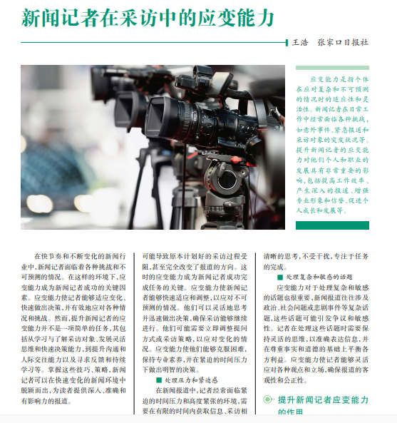 应变能力是指个体 在应对复杂和不可预测 的情况时的适应性和灵 活性。新闻记者在日常工 作中经常面临各种挑战, 如意外事件、紧急报道和 采访对象的突发状况等。 提升新闻记者的应变能 力对他们个人和职业的 发展具有非常重要的影 响,包括提高工作效率、 产生深入的报道、增强 专业形象和信誉、促进个 人成长和发展等。