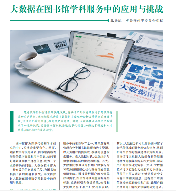 随着数字化和信息化的快速发展,图书馆正面临着日益增长的数字资 源和用户信息。大数据技术为图书馆提供了处理和分析海量信息的有效手 段,可以优化学科服务,提高用户满意度。同时,大数据技术也给图书馆带 来了一定的挑战,需要图书馆积极推进数字化转型,加强技术研发和人才 培养,以适应时代发展趋势。