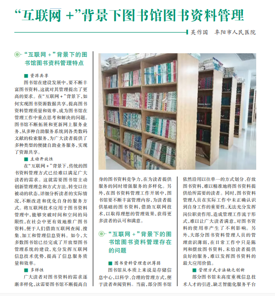 我国互联网技术迅速发展,在多个领域被广泛应用,获得显著的应 用效果。图书馆引入互联网信息技术,提升了图书数量和资料管理质量。 相应地,图书资料管理工作也要适应新时代发展要求,满足读者多元化、 个性化的需求。