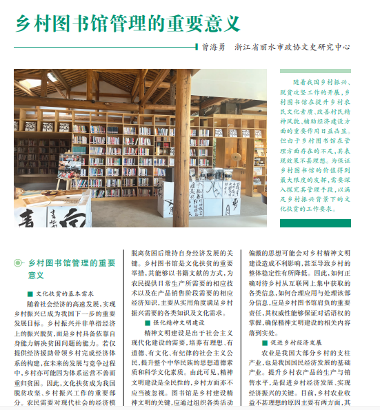 随着我国乡村振兴、 脱贫攻坚工作的开展,乡 村图书馆在提升乡村农 民文化素质、改善村民精 神风貌、辅助经济建设方 面的重要作用日益凸显。 但由于乡村图书馆在管 理方面存在的不足,其表 现效果不甚理想。为保证 乡村图书馆的价值得到 最大限度的发挥,需要深 入探究其管理手段,以满 足乡村振兴背景下的文 化扶贫的工作要求。