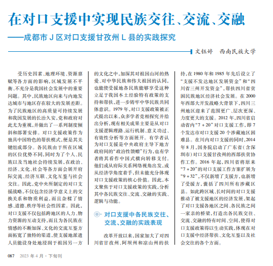 成都市 J区对口 支援甘孜州 L县,推动 了民族地区经济和社 会发展,提升了各民族 群众自我发展能力和 水平,使各民族群众在 共享高质量发展成果 的同时构建起和谐的 民族关系,为民族交往、 交流、交融提供了很好 的实践范例。