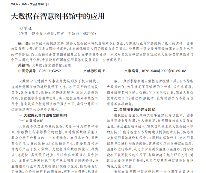 科学技术的快速发展,使得大数据技术得以应用到各行各业,为传统行业的发展提供了极大的支持。图书 馆发展到今天,需从多方面进行革新,才能确保满足人们的阅读与学习需求。智慧图书馆是提升图书馆职能与服务水平 的有效途径,而大数据则是智慧图书馆建立过程中的重要支撑。本文对智慧图书馆的建设现状及大数据在智慧图书馆 中的应用进行分析,希望能为我国智慧图书馆的发展提供一些参考意见。