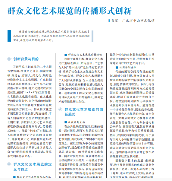 随着时代的快速发展,群众文化艺术展览传播方式呈现多 元化和创新化的趋势。为满足当代观众对艺术和文化体验的新 需求,展览形式的创新势在必行。