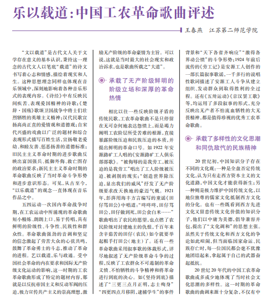 五四运动至第一次国内革命战争时期的工农革命歌曲以反抗帝国主义 和反动军阀压迫、宣传共产主义崇高理想、激励无产阶级革命豪情为主旨, 在反帝反封建的斗争中发挥了重要作用。工农革命歌曲不仅反映了当时的 社会现实和政治诉求,而且诠释了中国共产党特定历史时期的文化方针和 文化主题,并影响了早期中国化马克思主义文艺理论的形成。工农革命歌曲 所承载的艺术价值、文化价值和社会价值在当代仍然不可替代。