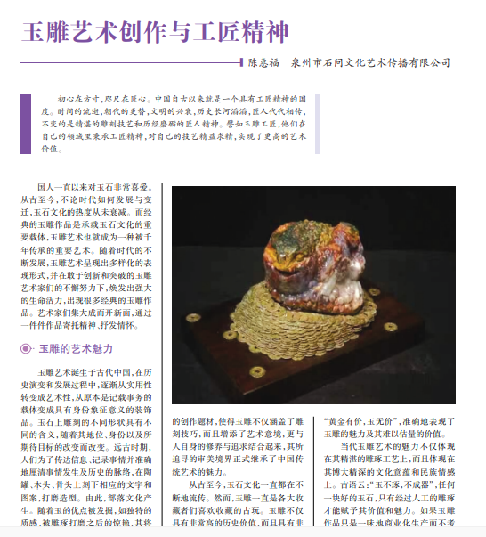 初心在方寸,咫尺在匠心。中国自古以来就是一个具有工匠精神的国 度。时间的流逝,朝代的更替,文明的兴衰,历史长河滔滔,匠人代代相传, 不变的是精湛的雕刻技艺和历经磨砺的匠人精神。譬如玉雕工匠,他们在 自己的领域里秉承工匠精神,对自己的技艺精益求精,实现了更高的艺术 价值。