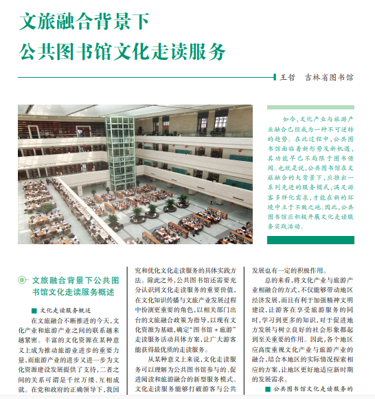 如今,文化产业与旅游产 业融合已经成为一种不可逆转 的趋势。在此过程中,公共图 书馆面临着新形势及新机遇, 其功能早已不局限于图书借 阅。也就是说,公共图书馆在文 旅融合的大背景下,应推出一 系列先进的服务模式,满足游 客多样化需求,才能在新的环 境中立于不败之地。因此,公共 图书馆应积极开展文化走读服 务实践活动。
