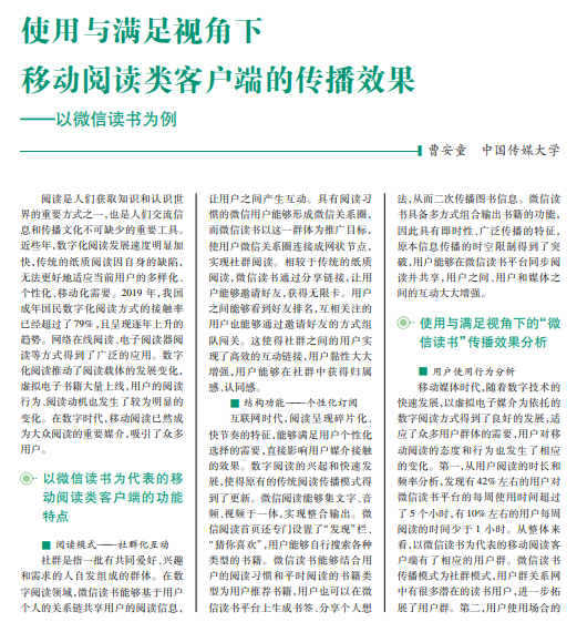 移动阅读类客户端的出台和应用,使得用户的阅 读方式发生了变化,由传统的单向集中、固定式的阅 读方式,转变为多项分散、数字化的阅读方式。分析 移动阅读类客户端的传播效果,发现传播过程中仍有 许多需要注意的问题。这些问题可能会影响用户的满 意度。