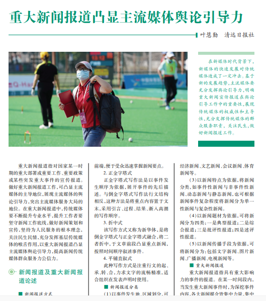 在新媒体时代背景下, 新媒体的快速发展对传统 媒体造成了一定冲击。基于 新的发展趋势,主流媒体要 充分发挥舆论引导力,明确 重大新闻宣传报道在舆论 引导工作中的重要性,展现 传统媒体的权威性和主导 性,充分发挥传统媒体的群 众服务职责,关注民生,做 好新闻报道工作。