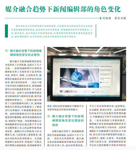 媒介融合是当今新闻传媒行业的新趋势,不同媒体形式的融合和交互正在改 变着新闻编辑部的角色,使其转变为知识管理者。新闻编辑部需学习新的技术、工 具,提升能力,适应快速变化的新闻环境,还要保持对新闻伦理和质量的高度关 注,始终坚持客观、公正的原则,方能在市场竞争中保有引领地位。
