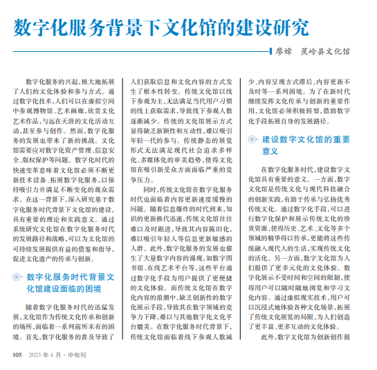 随着数字化服务时代的兴 起,科技与文化正以前所未有的 方式交织融合。传统文化馆面临 着新的挑战与机遇。随着线上文 化体验的日益普及,传统文化馆 的参观人数逐渐减少,传统内容 呈现方式显得滞后。如何借助现 代科技手段,创造更具吸引力和 互动性的文化体验,以适应数字 化时代的需求,成为文化馆建设 亟须思考的问题。