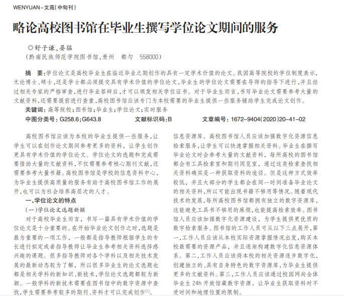 学位论文是高校毕业生在临近毕业之期创作的具有一定学术价值的论文。我国高等院校的学位制度表示, 无论博士、硕士,还是学士都必须提交具有学术价值的学位论文,毕业生的学位论文需要在导师的指导下进行,并且经 过相关专家的严格审查,进行毕业答辩后,才可以颁发相关学位证书。对于毕业生而言,书写毕业论文需要参考大量的 文献资料,还需要提前进行查重,高校图书馆应该专门为本校需要的毕业生提供一些服务辅助学生完成论文创作。