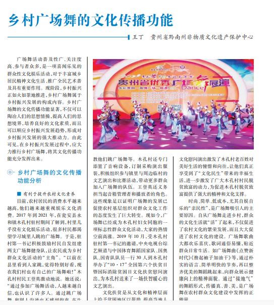 广场舞活动普及性广、关注度 高、参与者众多,是一项喜闻乐见的 群众性文化娱乐活动,对于丰富城乡 居民精神文化生活、推广全民艺术普 及具有重要作用。现阶段,乡村振兴 正如火如荼地推进,乡村广场舞属于 乡村振兴发展的构成内容。乡村广 场舞的文化传播功能显著,不仅可以 陶冶人们的思想情操,提高人们的思 想境界,培养良好的文化素质,而且 可以顺应乡村振兴发展趋势,形成对 乡村振兴发展的强大推动力。由此 可见,在乡村振兴发展过程中,应大 力推行乡村广场舞,将其文化传播功 能充分发挥出来。
