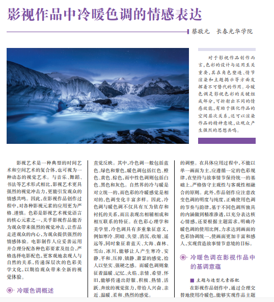 对于影视作品创作而 言,色彩的设计与运用至关 重要,其在角色塑造、情节 渲染和主题揭示等方面发 挥着不可替代的作用。冷暖 色调是影视色彩的关键组 成部分,可折射出不同的情 感效能,有助于强化作品的 空间层次关系,还可以渲染 作品的精神意境,让观众产 生强烈的思想共鸣。