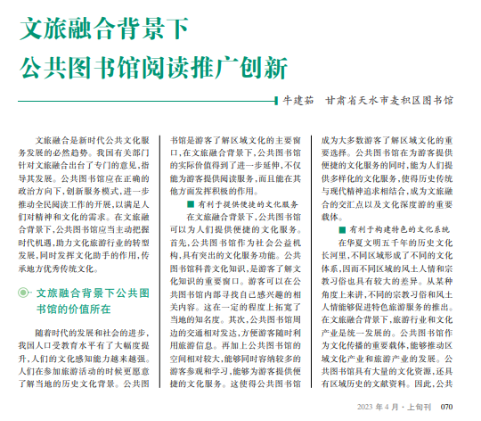 文旅融合是我国 针对国民需求提出的 重大发展战略,公共图 书馆作为重要的文化 设施,是文化传播的主 要载体,能够在文化和 读者之间搭建沟通的 桥梁。在文旅融合背景 下,公共图书馆应基于 社会发展和自身建设 实际,创新阅读推广, 为公共文化体系的构 建作出贡献。