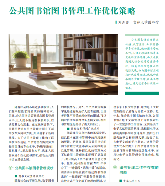 公共图书馆具有信息 传播、教育宣传、知识传播 等多项功能,做好图书管理 工作,不仅是推动文化事业 发展的重要选择,而且是提 高国民综合素质的重要手 段。随着现代信息技术的 迅猛发展,公共图书馆应顺 应时代发展潮流,优化和改 革图书管理工作,提高工作 质效,满足读者个性化读书 需求。