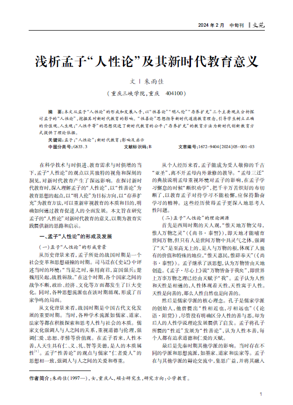 讨孟子的“人性论”,挖掘其对新时代教育的影响。“性善论”思想指导新时代道德教育理念,引导学生树立正确
