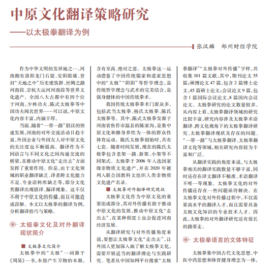 翻译好中原文化,对 于中原文化的发展、提高 文化软实力具有重要作 用。本文以太极拳这一传 统的体育运动为例,分析 太极拳文化对外传播的 方式及其翻译策略,以期 为中原文化的翻译传播 提供些许借鉴。