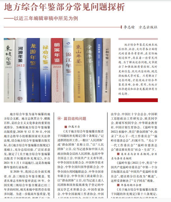地方综合年鉴是反映本地 区经济、社会、文化等各方面情 况的重要参考资料,在实际编 制过程中,存在着一些常见问 题。为了解决这些问题,文章提 出了加强数据质量控制、及时 更新信息、优化内容结构、规范 排版格式等对策。只有解决了 这些问题,才能使地方综合年 鉴更准确、全面、有用,为地方 经济建设和社会发展提供有力 的支持。