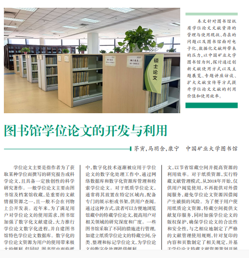 本文针对图书馆纸 质学位论文文献资源的 管理与使用现状、存在的 问题以及图书馆面对电 子化、数据化文献所带来 的压力,以中国矿业大学 图书馆为例,探讨通过创 新文献使用方式以及主 题展览、专题讲座访谈、 扩大文献宣传等方式提 升学位论文文献的利用 价值和使用效率。