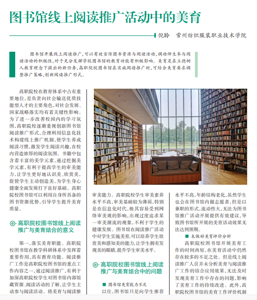 图书馆开展线上阅读推广,可以有效宣传图书资源与阅读活动,调动师生参与阅 读活动的积极性,对于充分发挥学校图书馆的教育功能有积极影响。美育是在立德树 人教育理念下提出的新任务,高职院校图书馆在实施阅读推广时,可结合美育要求调 整推广策略,创新阅读推广形式。