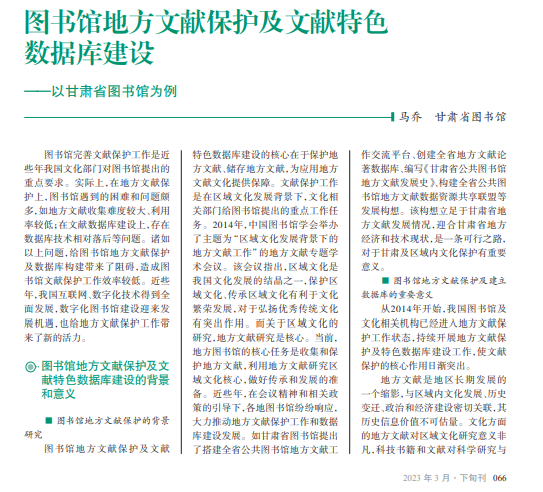 图书馆作为重要的文化传 播和文化保护机构,承担着保护 地方文献、建设文献特色数据库 等任务。尤其是在数字化图书 馆全面建设之际,图书馆必须集 中优势资源和先进技术,迅速构 建智能化、数字化文献保护及数 据管理平台,借助先进技术提升 图书馆文化保护工作质量。