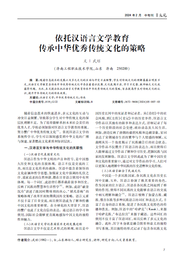 蕴等问题。为此,本文提出依托汉语言文学教育传承中华优秀传统文化的策略,旨在提高学生对传统文化的认