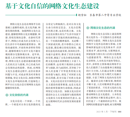 互联网给人 们带来了极大的 便利,使得社会生 活发生翻天覆地 的变化。在网络 环境多样化发展 的背景下,人们的 精神世界得到了 极大的丰富,但社 会大众的文化自 信也面临着新的 挑战。基于此,网 络文化生态建设 势在必行。